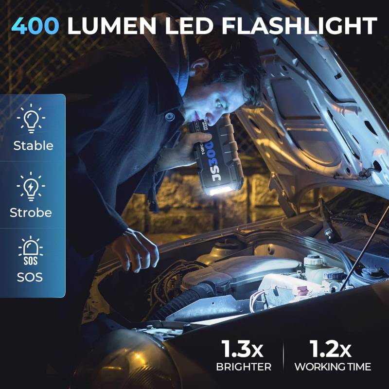 JS3000, разработанный для профессиональных и большегрузных автомобилей, оснащен качественными медными зажимами, прочными кабелями и огнестойким корпусом со степенью защиты IP54. Выдвижной крюк позволяет подвешивать фонарь, когда он не используется, или когда требуется направленный вниз источник света во время работы или кемпинга. Гибкая подставка позволяет поднять фонарь на 30 градусов. Благодаря 10 интеллектуальным технологиям защиты, его безопасно использовать любому человеку, будь то обычный водитель или профессиональный техник.