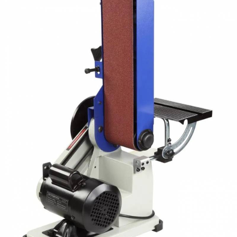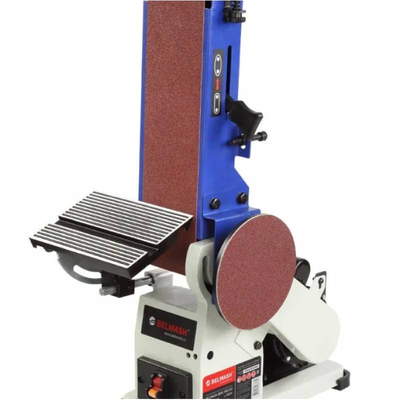 Станок шлифовальный ленточно-дисковый BELMASH BDG 100/152 S083A - корпус станка выполнен из чугуна. А опорная платформа из стали. Рабочий стол – алюминиевый с П-образным пазом под установку углового упора, он используется как при шлифовании лентой, так и диском. Угол наклона стола от 0 до 60 град. Блок шлифования лентой – поворотный.