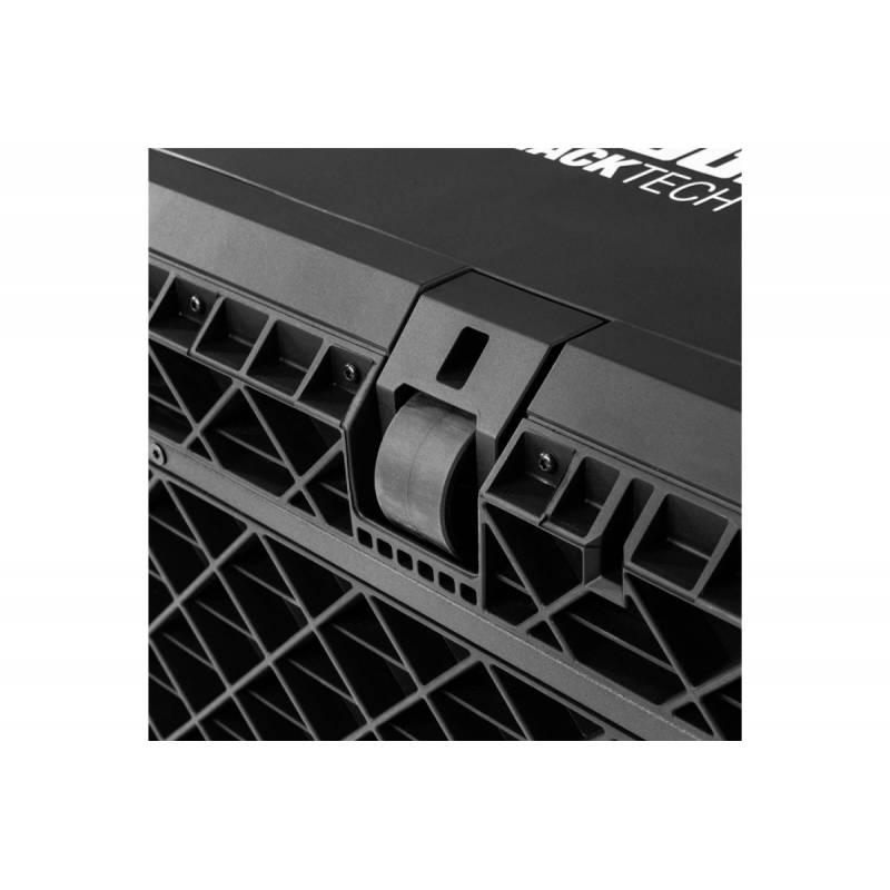 Ящик отличается высокой ударопрочностью благодаря бронированным углам и усиленной крышке. Телескопическая ручка легко снимается для удобной погрузки в автомобиль. Четыре точки фиксации обеспечивают неподвижность ящиков во время транспортировки.