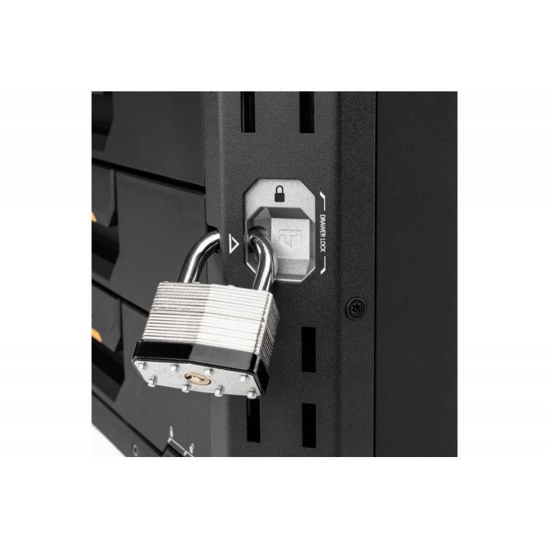 Этот четырехсекционный ящик для инструментов с четырьмя выдвижными ящиками идеально подходит для профессионалов. Он выдерживает нагрузку до 110 кг и оснащен автоматической блокировкой для надежной фиксации ящиков при транспортировке. Индикатор блокировки упрощает перемещение системы.