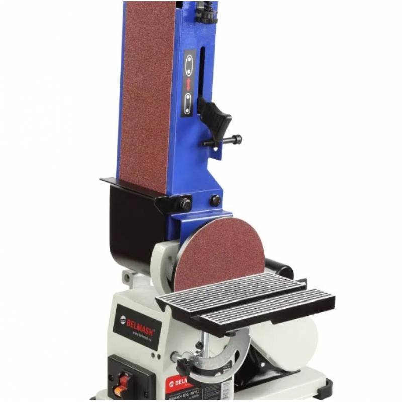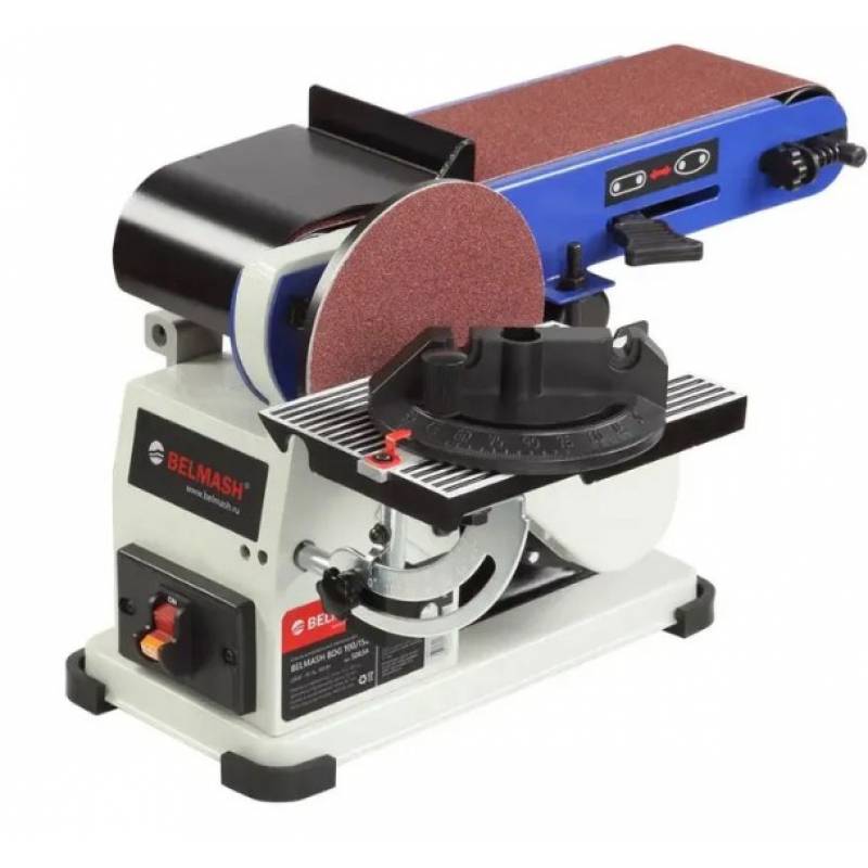 Станок шлифовальный ленточно-дисковый BELMASH BDG 100/152 S083A - корпус станка выполнен из чугуна. А опорная платформа из стали. Рабочий стол – алюминиевый с П-образным пазом под установку углового упора, он используется как при шлифовании лентой, так и диском. Угол наклона стола от 0 до 60 град. Блок шлифования лентой – поворотный.