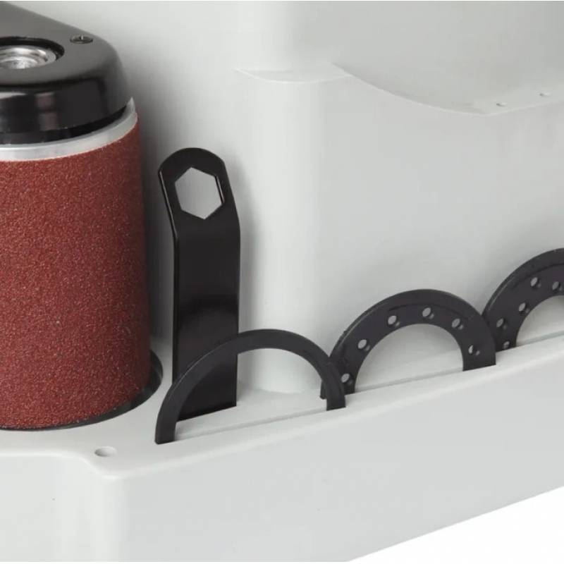 Ленточный узел имеет два обводных ролика разного диаметра, вокруг которых можно работать с вогнутыми поверхностями и прямой участок с металлической подложкой для плоских деталей из дерева. Движение ленты также происходит с осцилляцией, что повышает производительность и качество шлифования. Небольшие габариты и вес обеспечивают легкость размещения станка, а также рациональное хранение и транспортировку. В основании станка расположены ложементы для хранения всей оснастки