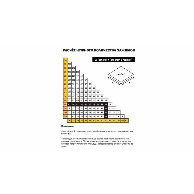 - Необходимое количество клиньев составляет около третьей части количества зажимов. Также вы можете заказать клинья в количестве, которое потребуется на ту площадь, которую мастер сможет уложить за день.