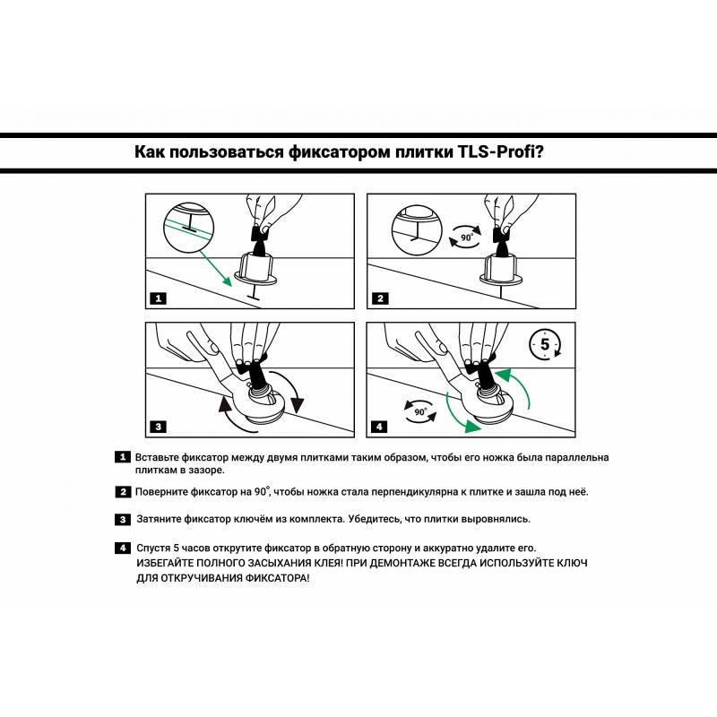 Фиксатор плитки TLS-Profi - дополнительный инструмент для затяжки плитки в плоскости. Используется вместе с системой выравнивания плитки TLS-Profi (для швов от 1 мм) в случае установки недостаточного количества зажимов. Может использоваться многократно. В упаковке 20 фиксаторов + ключ + 10 игл.